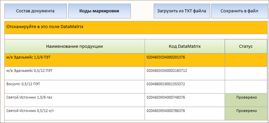 4. Установите курсор в область ввода данных, и с помощью 2D сканера отсканируйте DataMatrix с каждой продукции. Примечание: