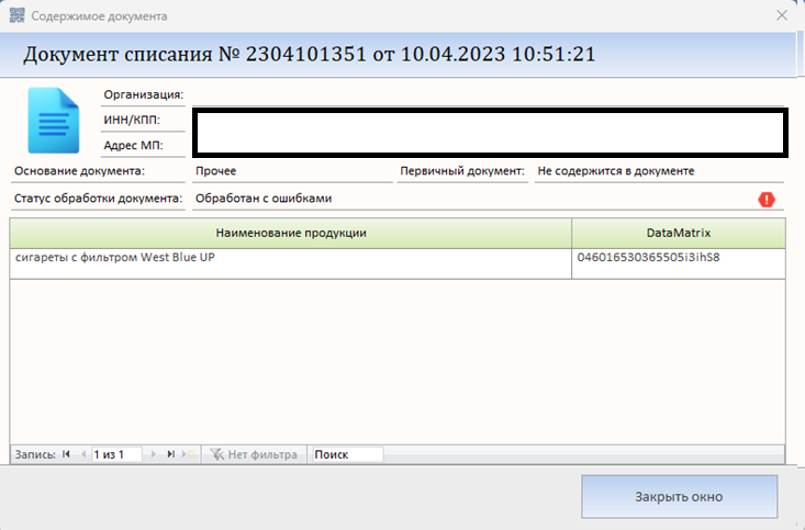 При двойном клике ЛКМ по DataMatrix отобразятся полные сведения по КМ (Подробнее в разделе 7.3.Получение сведений о КИ).