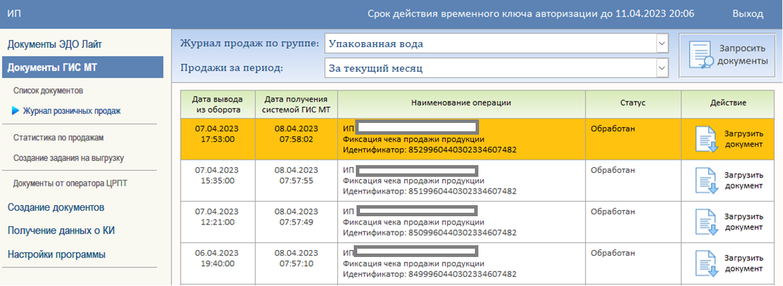 В данном разделе реализована возможность получения истории движения КИ принадлежащих текущему пользователю. В списке отображаются документ прихода и расхода продукции. Для просмотра документа, нажмите кнопку «Загрузить документ» в строке требуемого документа. (Подробнее о документах в разделах 6.1.Список документов, 6.2. Журнал розничных продаж)