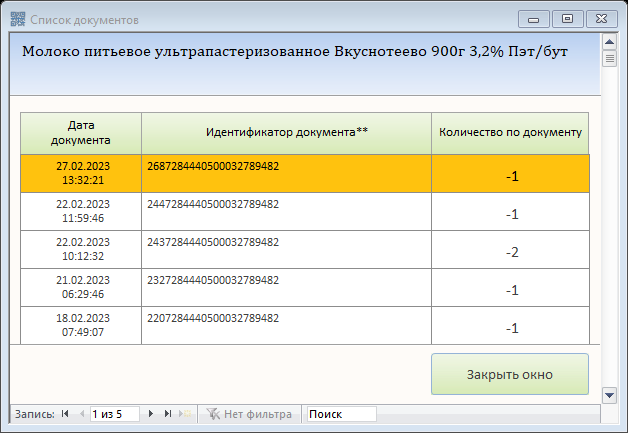 При двойном клике ЛКМ по идентификатору чека откроется состав чека, в котором находился КМ (Подробнее в разделе 6.2. Журнал розничных продаж).
